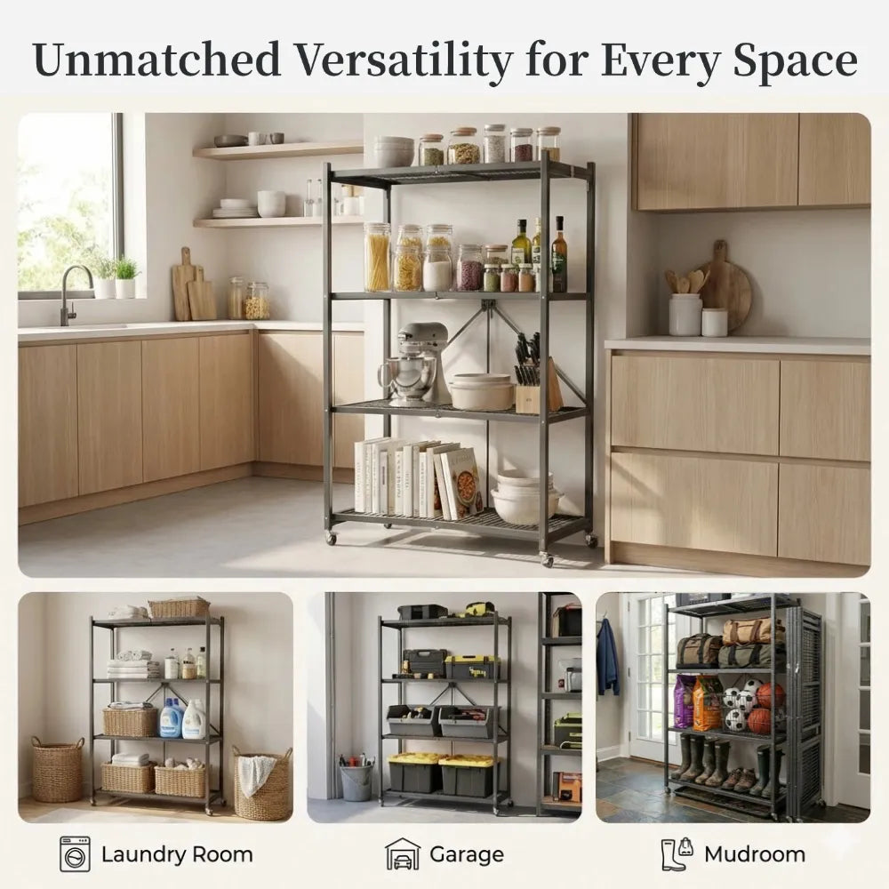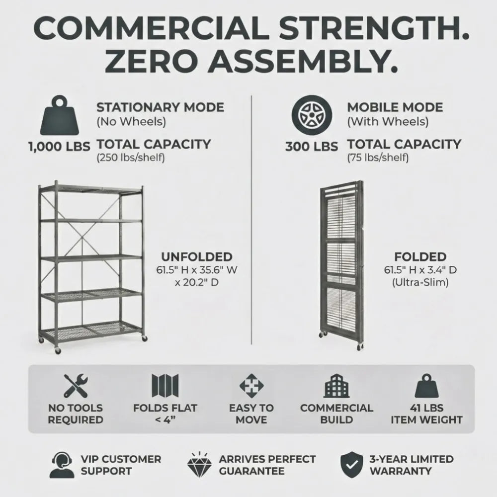 Heavy-duty storage made simple. 100% pre-assembled and tool-free. Unfold it instantly to organize your space with industrial-strength reliability.